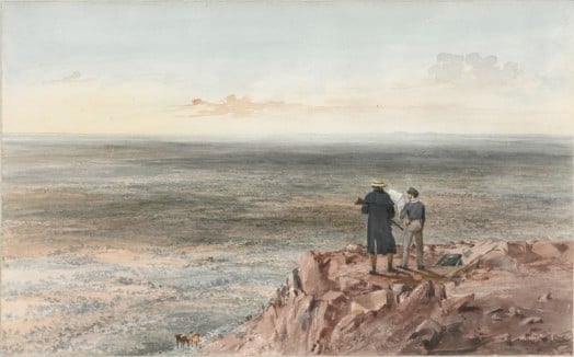 The taller figure with the gun is Horrocks, the other with a sketchpad is Gill – one claiming and naming the country in front of him, the other recording it.